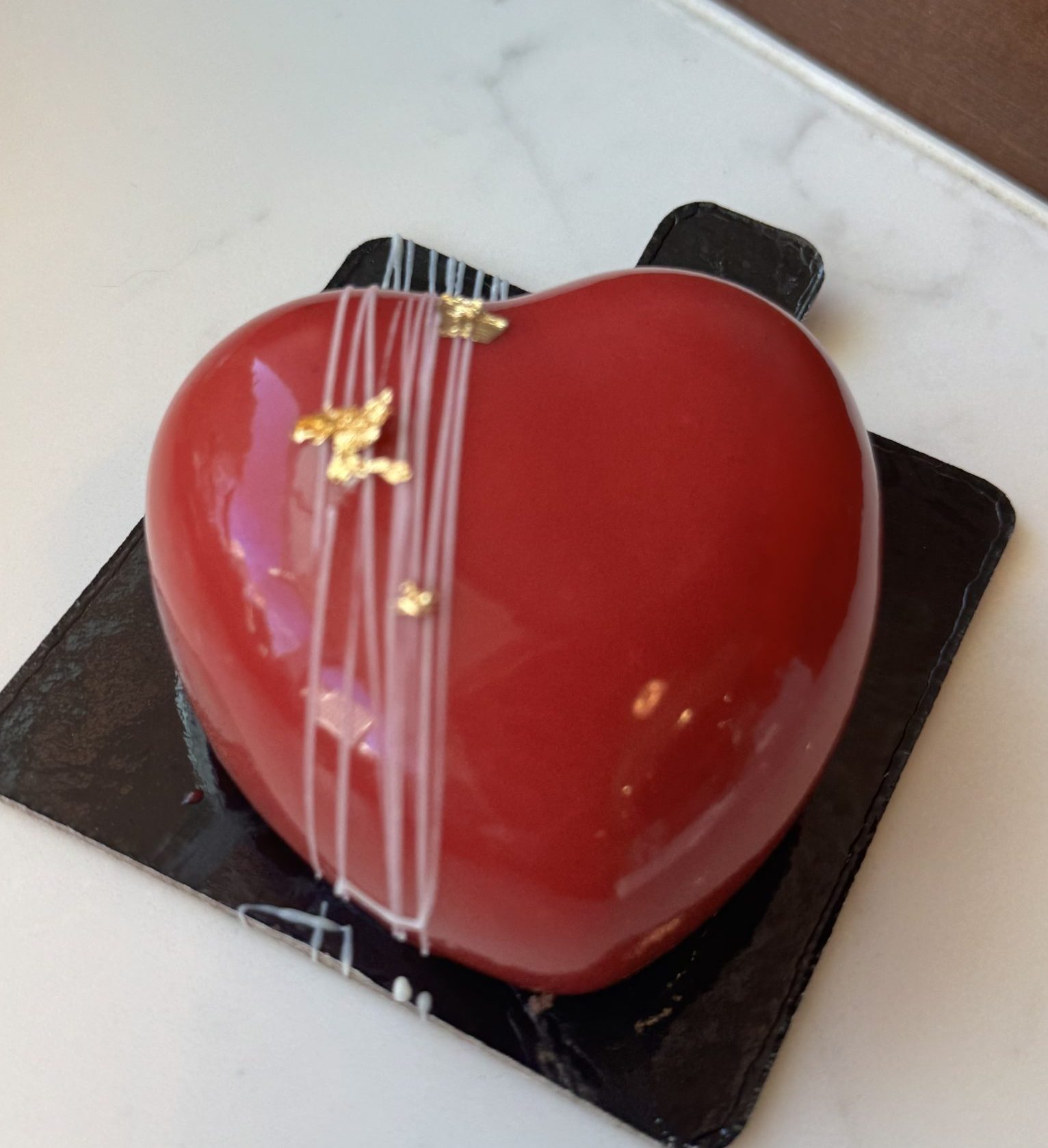 Intense raspberry flavour.  Dark chocolate mousse, raspberry coulis and feuilletine crunch.